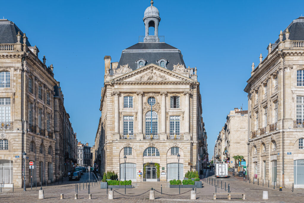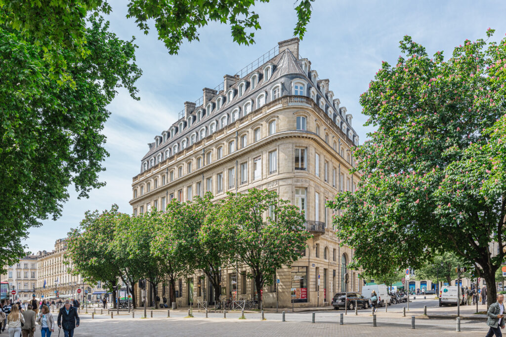 Superbe immeuble en pierre de Bordeaux situé en centre-ville, avec façades élégantes, balcons en fer forgé et boutiques en rez-de-chaussée, sous un ciel bleu ensoleillé.